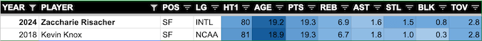 This is especially concerning when you consider all of the parallels, not only statistically but physically, age, youth hype, and so on. Risacher should probably be drafted closer to where Knox was (9th overall) than the first pick.