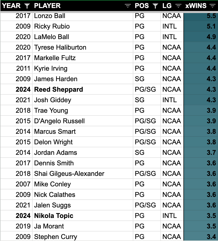 Sarr’s main challenger for the top pick in 2024 is fellow Frenchman Zaccharie Risacher, who made a late push thanks to a strong performance in the French league playoffs. Risacher is also an appealing prototype as a young, 6’8″ wing who shot nearly 40% from beyond the arc this season. However, the rest of his game leaves some to be desired, as you can see by his draft model projection which puts him nowhere near the top pick. Only infamous bust Anthony Bennett had a lower projection among #1 picks since 2006. The Risacher comp that no one wants to confront is Kevin Knox.